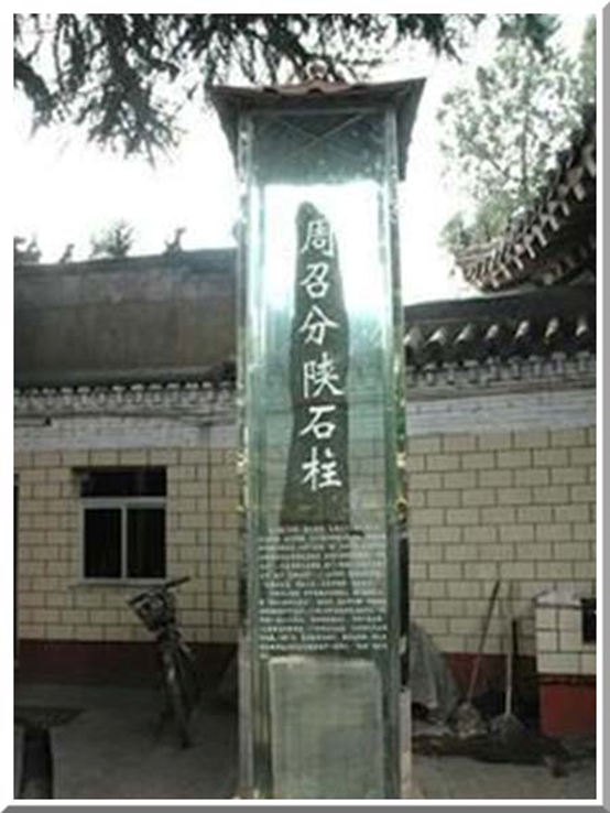 “周召分陕”,是以“陕塬”(今河南三门峡陕县张汴塬)为分界线,把西周王朝的统治区划分为东西两大行政区,由周王朝的开国重臣“分陕而治”。当年周公旦、召公奭二公商定后,凿了一根高三米五的石柱栽于分界之处,称作“立柱为界”。据史籍《左传·隐公五年》记载:“自陕而东者,周公主之;自陕而西者,召公主之”。