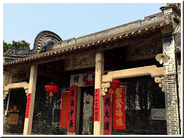 作为总祠的区氏宗祠自然是多座祠堂中规模最为庞大的一座,其建筑形制最为完整,装饰造型最为精致豪华。区氏宗祠为单檐歇山式屋顶,檐面一层层铺以青灰色瓦片,瓦当为云纹状黄色琉璃。屋顶上的博古脊引人人胜。墙体白底黑边,十分醒目,装饰意味十足。屋檐下的大门上方悬红底金字门匾,双扇大门上彩绘各持利器的门神。门口有联云:“华山乔木千章秀,春水支流万派同。”门前石柱对联为:“日月旋天柱,鱼龙变伴池。”墙体与石柱之间有一对包台墩,为娶亲摆酒时乐队演奏场所。
