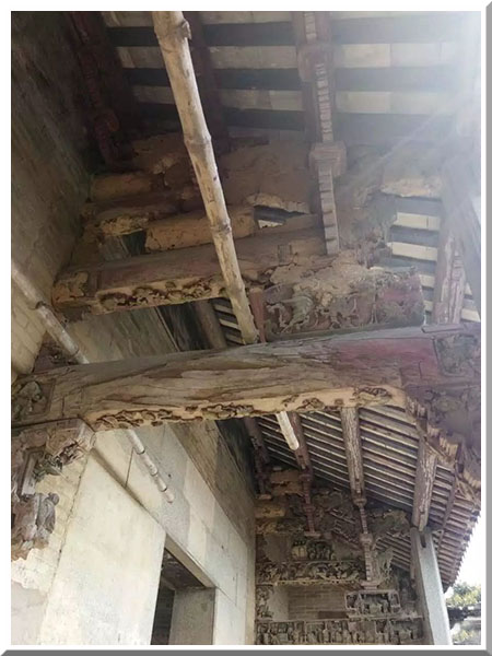 惜文革浩劫岁月,大院难逃厄运。神龛金匾被砸,窗楹门梁的雕刻都被斧劈一尽,门楼石刻被掀翻,大院文化被当成封、资、修和“四旧”抄得一片狼藉。土改被分进去住的12个农户,亦在近30年里先后扩居,已将原来的大院撤改得面貌全非,除原后堂还有两间残存的房屋外,惟有一条约两米高的由石麻条砌成的石坎,还刀切斧剁般的挺立在那,半个古老的“丹池”却在新砌住房的墙角下呻吟。