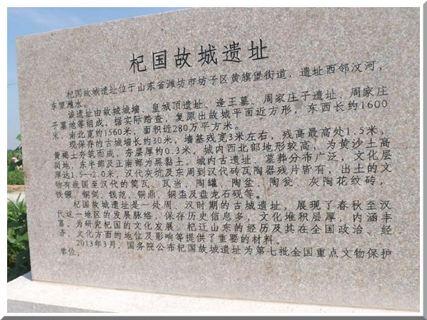 杞国故城遗址位于山东省潍坊市坊子区,是春秋至汉代时期的古城遗址,坊子区最大的文物遗址。杞国故城东西长约1600米,南北宽约1500米,面积接近280万平方米。杞国故城遗址由杞国故城城墙、皇城顶遗址、周家庄子遗址、周家庄子墓地、石佛寺遗址和九女冢组成。2013年5月,被国务院核定公布为第七批全国重点文物保护单位。