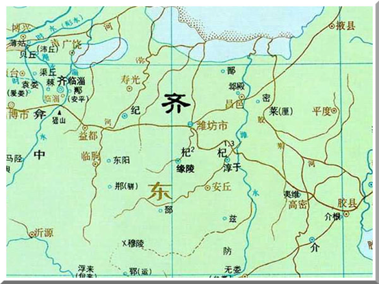齐 郡:西汉时期先为临淄郡,后改齐郡,治所在临淄(今山东淄博),其时辖地在今山东淄博市和益都、广饶、临朐等县地。唐朝玄宗天宝元年(壬午,公元742年),改为青州北海郡,属河南道,县为属。唐肃宗至德二年(丁酉,公元757年),北海郡仍改为青州。唐朝宗(唐代宗)永泰元年(乙巳,公元765年),道改为军,齐郡属平卢军节度使领辖,治所在益都,其时辖地在今潍坊等一带地区。